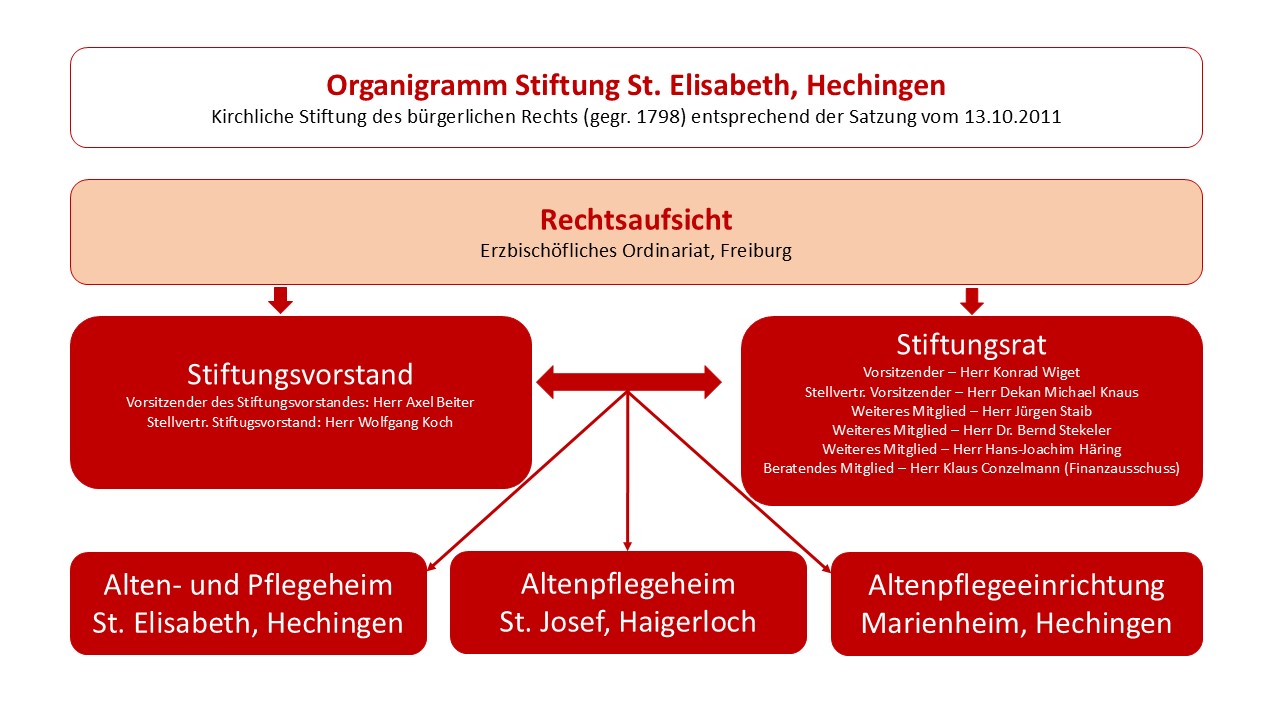 Laut Satzung vom 13.10.2011 besteht die Stiftung aus den Organen des Stiftungsvorstandes und dem Stiftungsrat, als kontrollierendes Organ. Der Stiftungsvorstand besteht aus zwei hauptamtlichen Vorständen - dem Vorsitzenden und dem stellvertretenden Vorsitzenden - die vom Stiftungsrat gewählt werden. Die Aufgaben des Stiftungsvorstandes bestehen darin, die laufenden Geschäfte der Stiftung im Rahmen des Haushaltsplans zu führen. Der Stiftungsrat trifft die grundsätzlichen Entscheidungen und überwacht die Aufgaben des Vorstandes. Als kirchliche Stiftung des bürgerlichen Rechts unterliegt die Einrichtung St. Elisabeth der Rechtsaufsicht des erzbischöflichen Ordinariats in Freiburg.